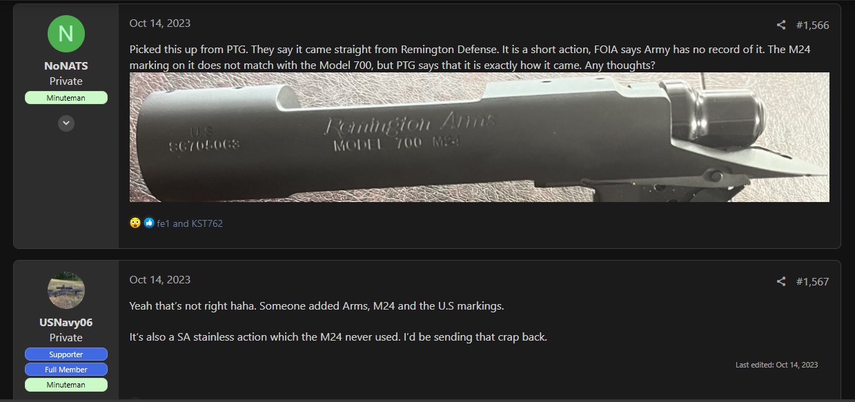 I dipped my toes in the US sniper rifle clone game for a couple years. I believe that barreled action was intended for that. Original parts are very rare and pricey. I bet if we removed the US stamping we wouldn’t even be discussing it. PTG has been caught over the last couple years trying to pass fake parts as original vintage parts. I posted the M24 pics as an example of one instance of them adding rollmarks to a receiver to pass it as something it wasn’t.