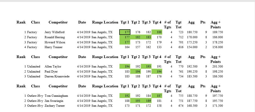 Tom Cunningham took 1st place in Senior Outlaw Heavy with the high 1st & 4th targets and an agg of 188.75. Jim Swaringin took 2nd place
