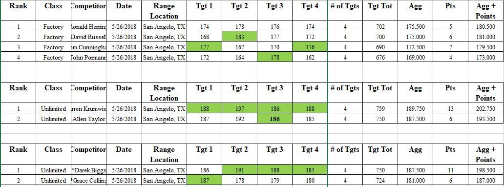 Tom Cunningham took the high 1st & 4th targets in Senior Factory. David Russell took the high target of the day with a 183 on the 2nd target. John Pormann took the high 3rd target. Ron Herring took 1st place; David Russell took 2nd; Tom Cunningham was 3rd & John Pormann was 4th.
