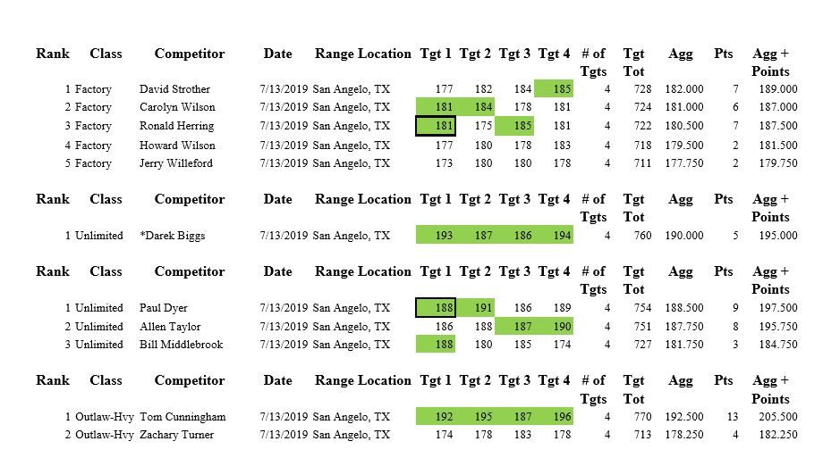 Allen Taylor took the high 3rd & 4th cards and had an agg of 187.75 for 2nd place. Bill Middlebrook swapped Senior Heavy Barrel this week for Unlimited and took 3rd place.