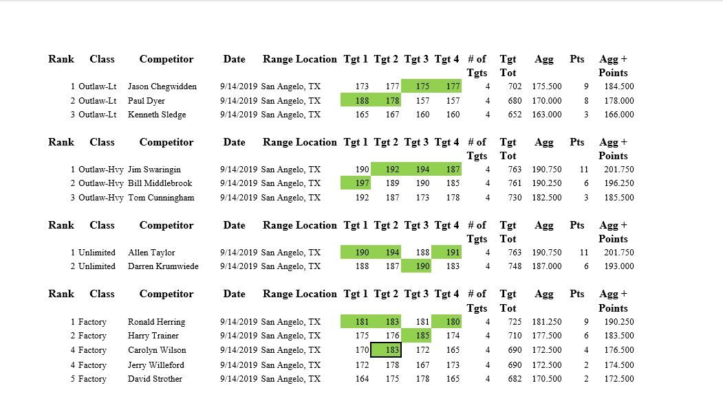 Ron Herring took 1st place in the Factory class with a 181.25 agg and the high 1st & 4th targets. Harry Trainer took 2nd place and had the high for this class with a 185 on the 3rd target. Carolyn Wilson was 3rd and won the tie on the 2nd target with a 183. Jerry Willeford was 4th and David Strother was 5th.