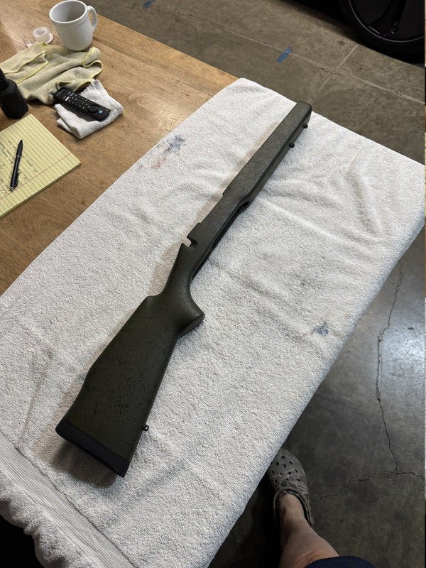 Remington 700 Long Action BDL with a varmint barrel channel. Olive green with black webbing