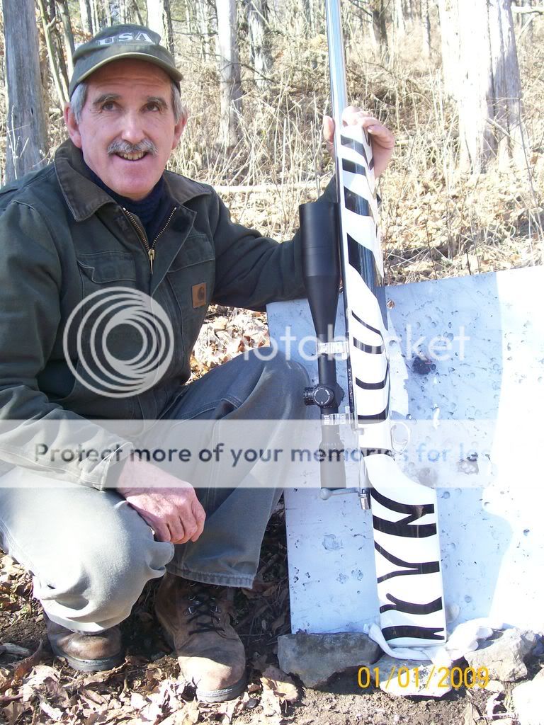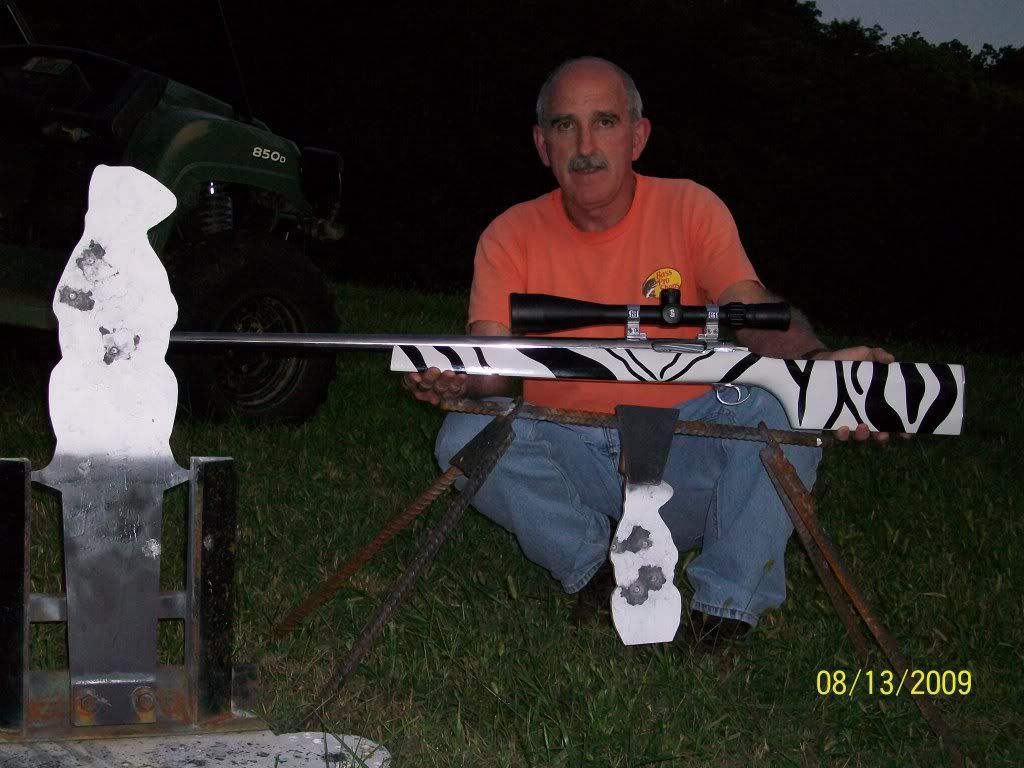He took 3 sighters on the metal plate and the first two made two little black spots