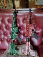 The green one is a 22-250AI, R 700, McMillan Sako varmint pattern. Third 22-250AI barrel on this action, is a 14 twist 25" Walther barrel, 0 freebore no turn neck. Very effective brake. It uses the strong PMC brass, but Lapua web is too large to chamber. Luckily I've plenty of PMC. It's probably the most remarkable barrel I have. After 90rds it'll show a trace of blue on the first Montana Extreme patch, then nothing after that. These were with 4000fps/50BT fireform loads. RL15powder. It chewed ragged hole groups fireforming and shoots ragged hole groups at 4200 with formed brass. No targets loaded into the computer or I'd post them. It's been a favorite for a long time.