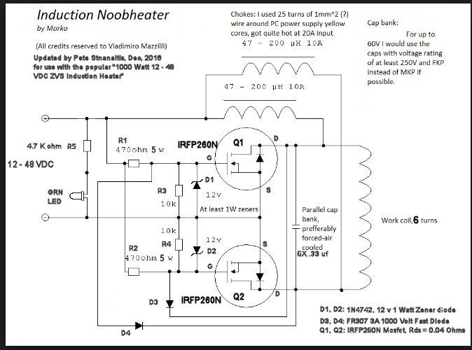 He took Mazilli's flyback circuit and modified it to work as an induction heater. Note his comments about using the liquid cooling system to also cool the MOSFETs.