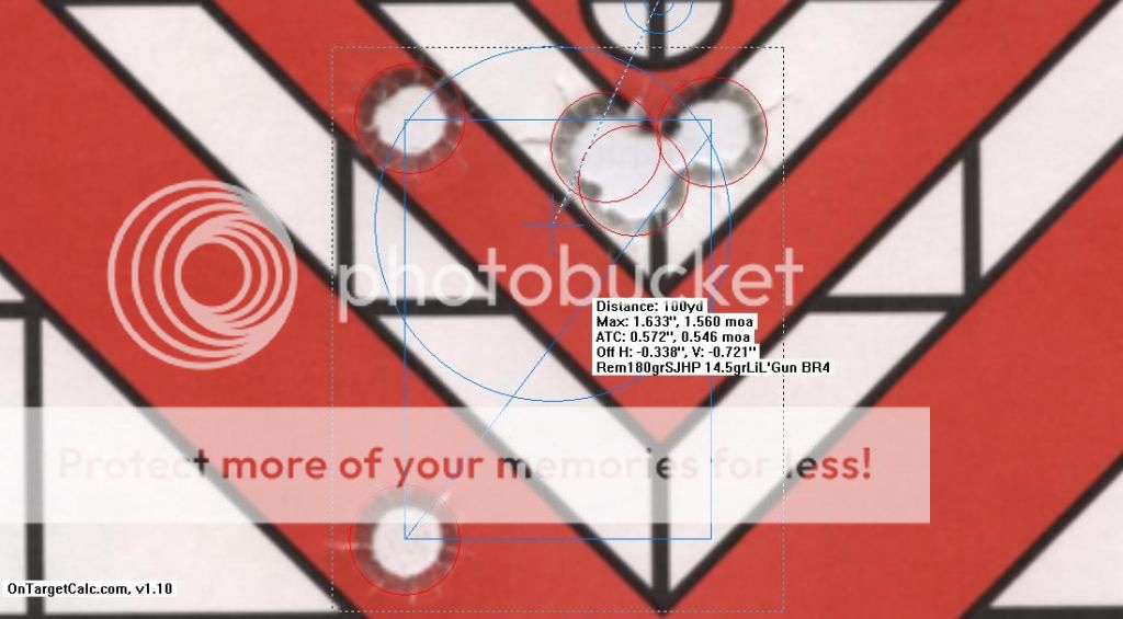 5 rounds from 100 yard Bench, Remington 180 grain SJHP/Lil'Gun/BR-4/Starline case.