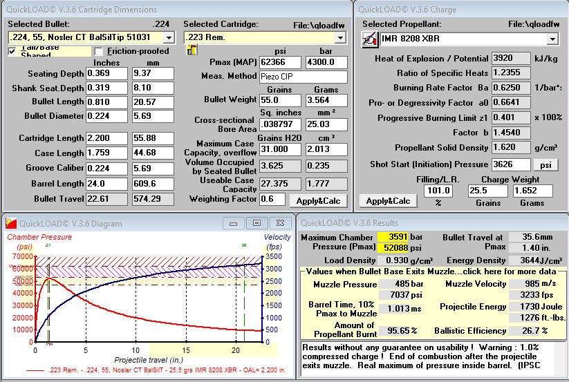 The default values in QL need to be used with some skepticism. Models have context and you don't know which details in the donated model are the same as yours. With 223, case volume varies widely. Many will load bolt guns to 556 pressures with good brass life. That CCI 400 primer probably won't work with that trick. I matched this one to the Hodgdon data by using a typical case capacity for the Lake City brass I use. Winchester should be similar. Not sure about Remington.