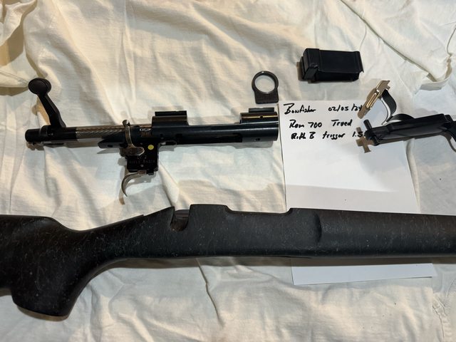 Selling action, with stock, all the bottom metal parts, aftermarket stock screws, two-piece pic rail etc. Front of action has been trued, lugs lapped, Rifle Basix trigger, 1.5lbs. Very nice. Want to keep it together because of the nice fit. We'll see how it goes.