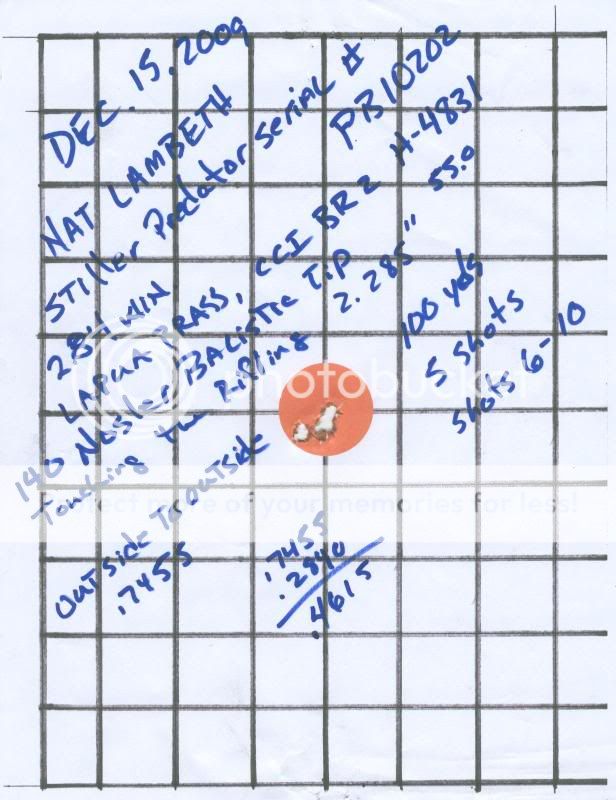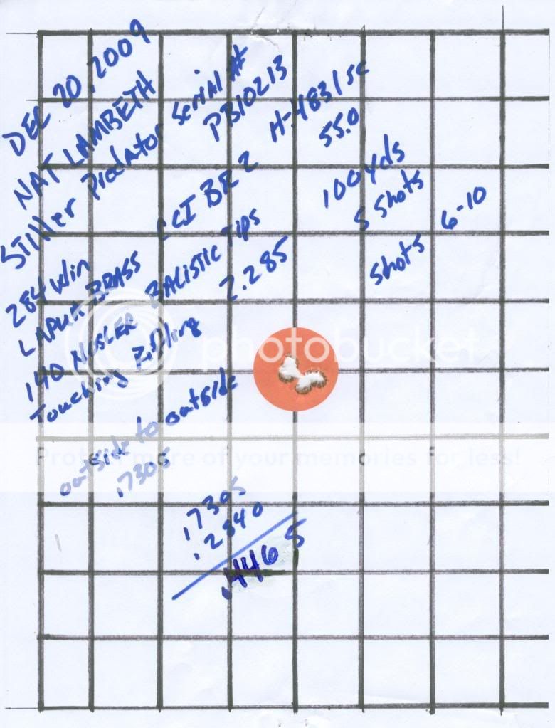 I have two customers who placed orders for a custom hunting rifles that were able to take deer at long distances. These rifes are the same except for action serial number, color, and barrel length. One has a 25" barrel and the other a 26" barrel. The actions are stiller Predator, the barrels are Broughton .284, 1:9, 5C. The stocks are McMillian, the bottom metal is PT&G Stainless Steel, the mag boxes are Wyatt Outdoors, heat treated CM, center feed. Attached are photos and the target of the first five shots from the Black rifle.