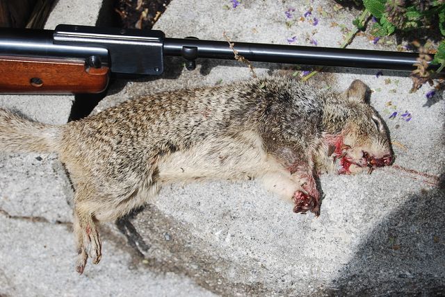 I pumped it up about twenty times and waited. Sure enough, he eventually cameback out to finish his lunch. I waited until he had settled in to the tomato and squeezed one off. I could tell it was a good hit and he scampered off. I figured he might decide to move if the neighborhood started going downhill.