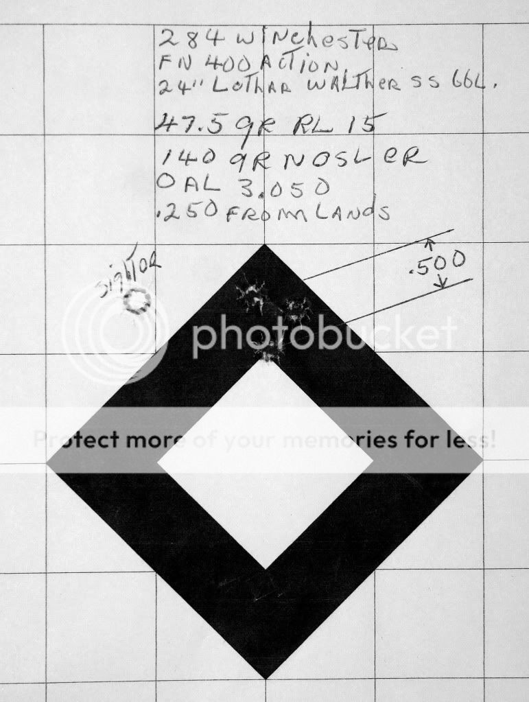 What affect does a long throat length have on velocity? Does it act to increase or decrease it or is there no affect? This is a group I shot with my 284 Win I just built with a long throat by mistake. As you see I am .250 off the lands. I had thought that accuracy was really going to suck but I was wrong.