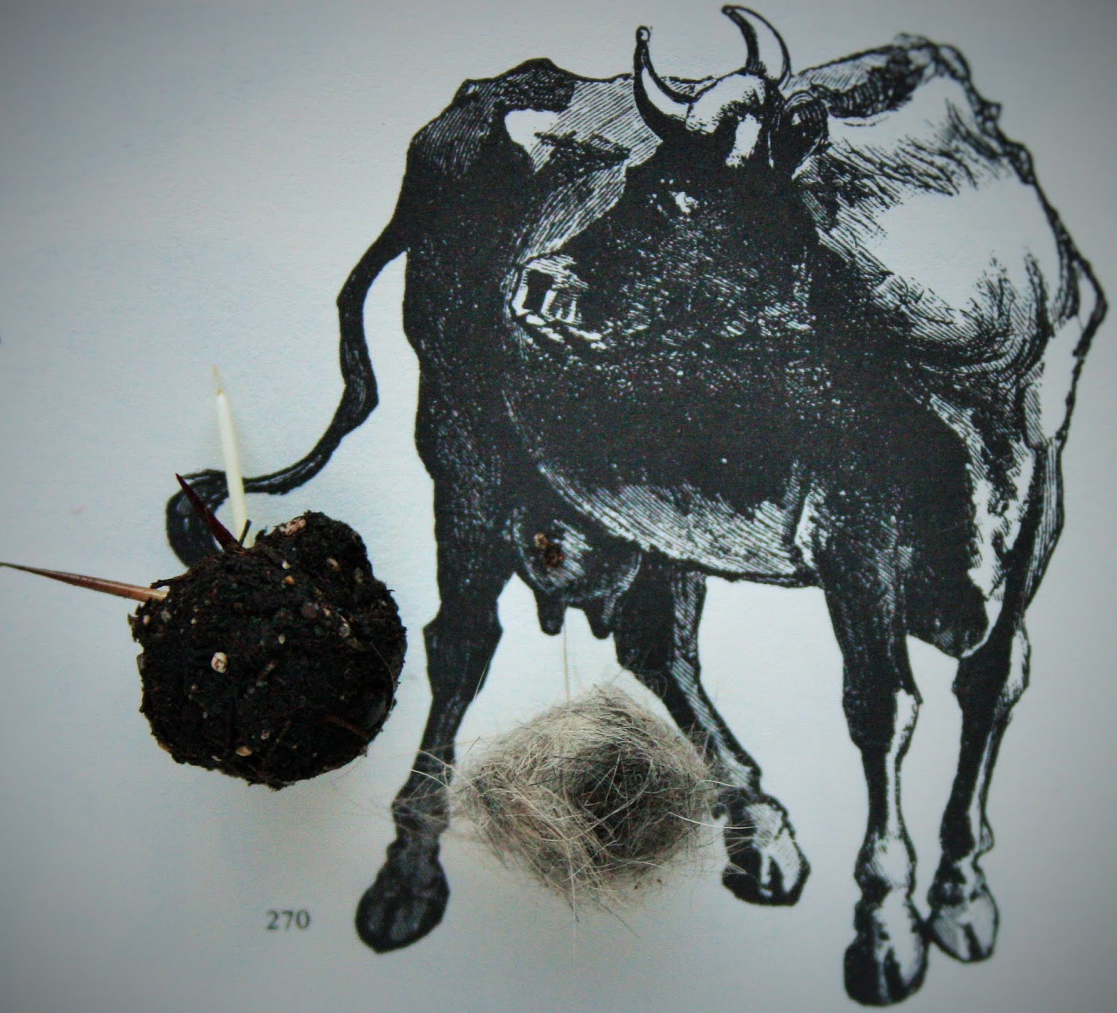 "In some of the states, a spell may be put upon a man by burying a "hair-ball" (one of the compact balls of hair often found by butchers in the stomachs of cows or oxen) under his doorstep. This object (powerful, because peculiar) may also be carried about as an amulet to protect one from spells."- Newbell Niles Puckett,