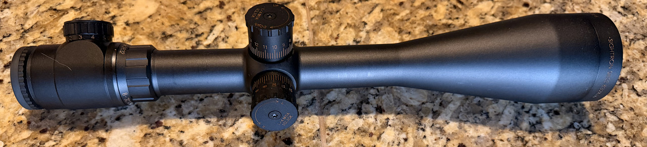 Rare Sightron SIII 8-32x56 LR IR with the illuminated MOA-H reticle. This is an illuminated reticle with a small floating center dot for precise aiming and a "Christmas Tree" for more aiming points or measuring. This a SFP scope and the entire reticle lights up for use in low light conditions.