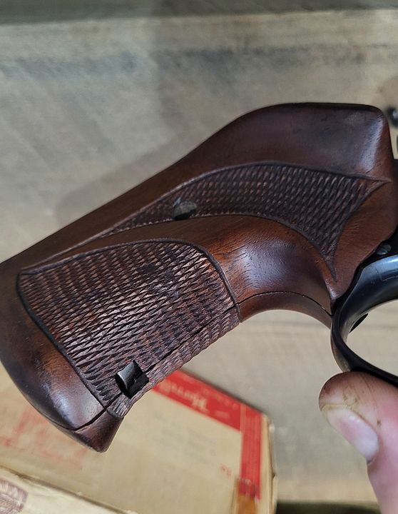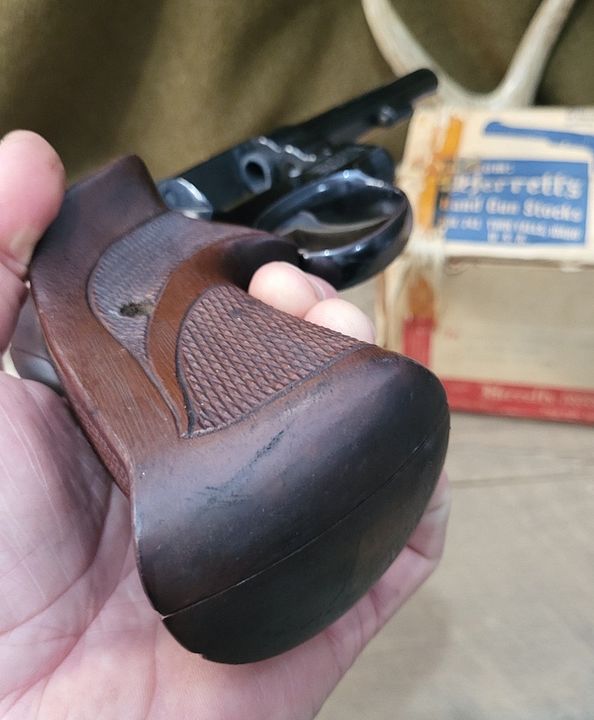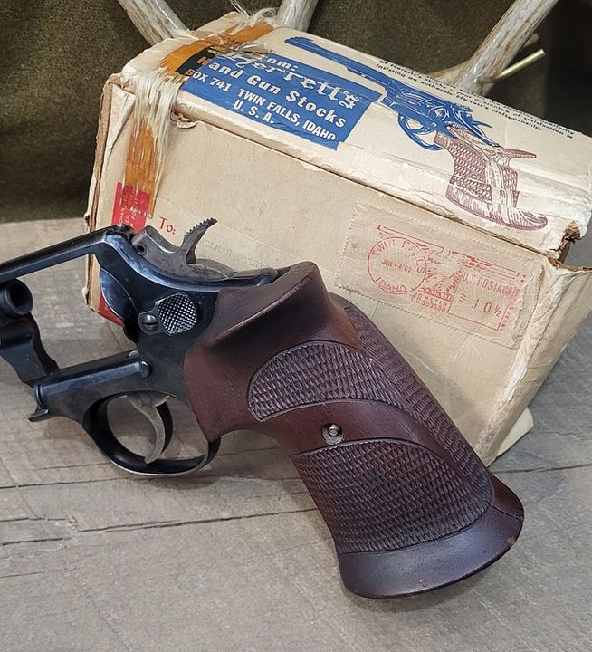 LH checkered walnut vintage Herretts for K Square butt. With screw. Really nice shape, small blemishes. Original box post marked 1962. $75 shipped OBO shown on a model 10 SB
